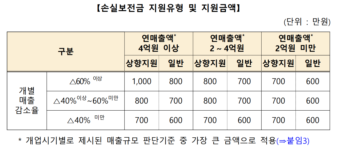개별 매출 감소율과 연매출액에 따라 지원되는 금액은 차이가 있는데요. 아래 표를 확인해주시면 됩니다.